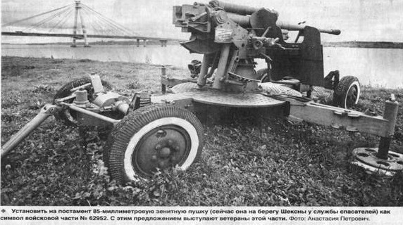 85-миллиметровая пушка участвовала в боях под Москвой, а в послевоенное время несколько десятилетий была экспонатом Музея боевой славы войсковой части 62952, располагаясь на постаменте в военном городке. В настоящее время пушка находится на территории спасательной станции МЧС. Ветераны на свои средства изготовили и укрепили на орудии памятную табличку, которую в торжественной обстановке открывал Олег Кувшинников перед избранием его на пост мэра Череповца.