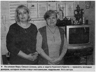 Помимо всего прочего, в череповецком отделении Красного Креста уже около трех лет работает «Служба милосердия», организующая уход за больными. Правда, стоит отметить, что услуги сиделок и сестер милосердия платные (работа организуется через Центр занятости населения) — часть средств идет на уставную деятельность организации. Также в прошлом году организованы общественный донорский совет и Общественный университет здоровья (библиотека № 6).