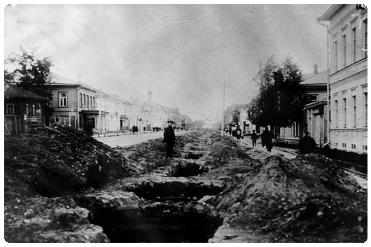 Первая бытовая канализация в городе была проложена из деревянных дубовых досок в виде каналов прямоугольного сечения с деревянными рубленными колодцами по Советскому пр., ул. К. Либкхнехта, ул. Ленина. К централизованной канализации были подключены 43 здания. Сточные воды отводились в р. Ягорбу без очистки. Протяженность сетей канализации составила около 3 км.