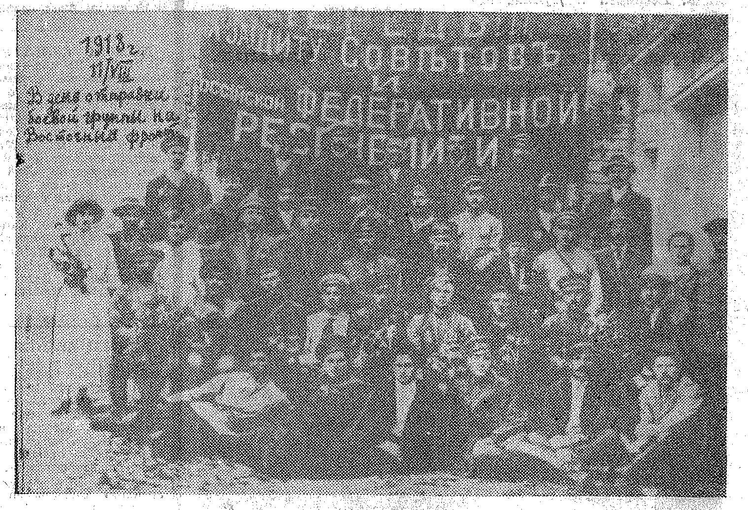 ...А сейчас передо мной лежит фотография, которой более полувека. Слева приписка: «В день отправки боевой группы на Восточный фронт - 11 августа 1918 года». Лица добровольцев, уезжающих на борьбу с Колчаком, решительны и сосредоточенны. В тот далекий погожий августовский день на перроне станции Череповец тоже был митинг перед отходом поезда, увозившего бойцов-добровольцев на защиту социалистической Отчизны.