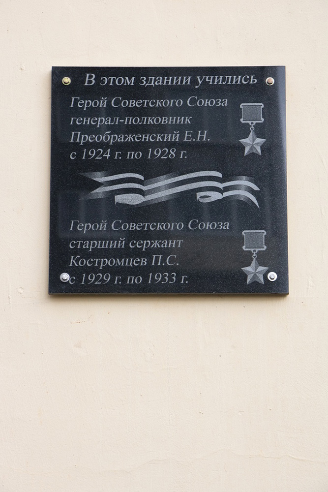 Мемориальная доска была установлена в 2015 г. вместо прежней, имевшей неудовлетворительный внешний вид. Она посвящена не только Петру Костромцову, но и еще одному выпускнику Череповецкого педагогического техникума - Евгению Николаевичу Преображенскому.