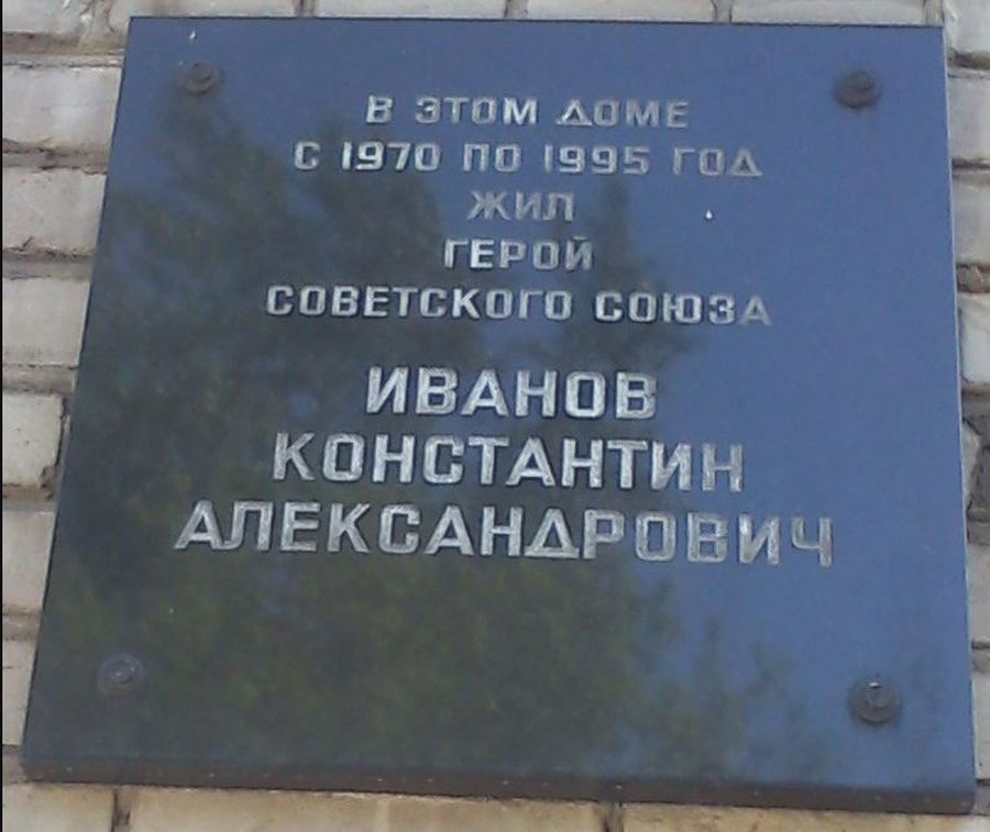 Первую мемориальную доску в память о герое установили в 1996 году. Торжественное открытие памятного знака состоялось 22 июня. Автором мемориальной доски был череповецкий скульптор Александр Шебунин. Её отлили на Череповецком металлургическом комбинате. На памятном знаке был размещен портрет - барельеф К. А. Иванова с надписью: «В этом доме жил с 1970 по 1995 год Герой Советского Союза Константин Александрович Иванов». К сожалению, в неспокойные 1900-е годы украли два экземпляра доски, после чего она была заменена на мраморную с такой же надписью, но без портрета Героя.