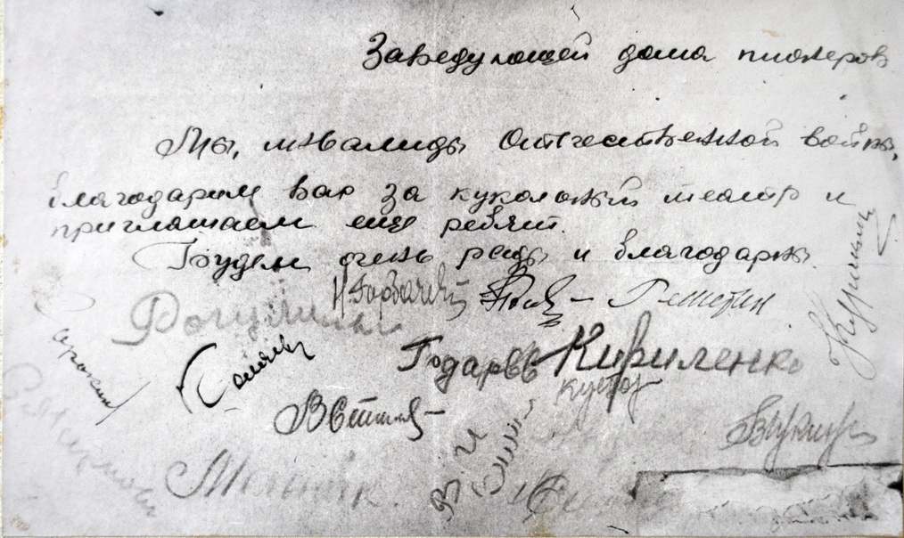 «Привет с фронта! Добрый день, Людмила! На Ваше письмо мы, бойцы и командиры взвода разведки, пишем вам ответ. Спасибо Вам, дети за Вашу любовь и заботу о Красной Армии. Вы учитесь только на отлично, а мы будем бить врага без пощады!…»