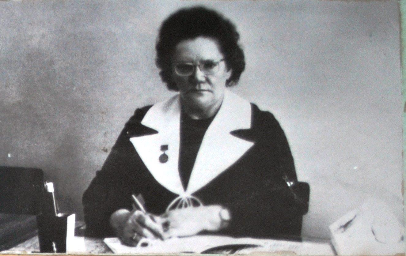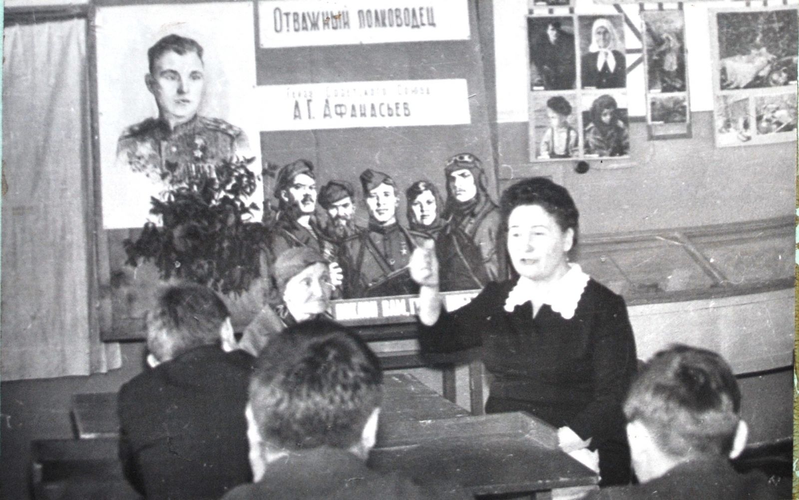 На фото: "В краеведческом музее средней школы №17 (ответственная за краеведческую работу Бабанова Ангелина Михайловна)"
