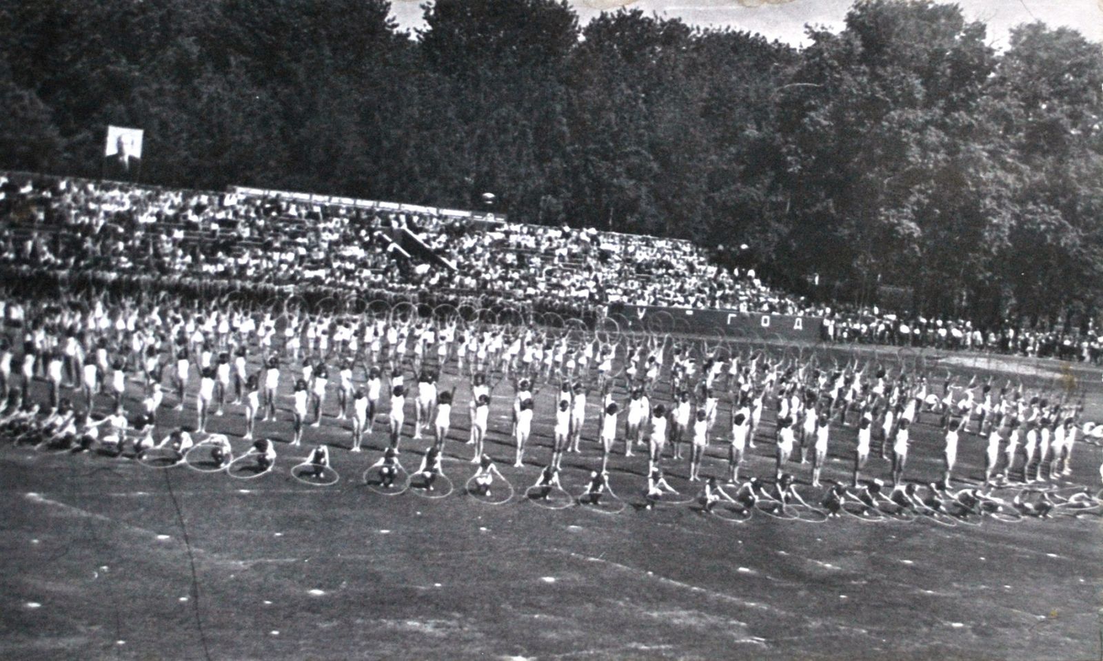 На фто: "На уроке физвоспитания в школе №9 (учитель Журавлев В.А.)", "Гимнастические выступления школьников на стадионе «Металлург», июнь 1967 г. (ответственная за выступление тренер ДЮСШ №1 Сергеева И.А.)