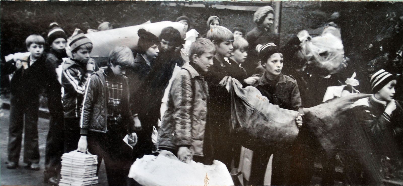 Фото: "Трудовой десант – сбор макулатуры (клуб «Мальчиш-Кибальчиш»)", "Ветераны – воспитатели клубов по месту жительства, начальники городских детских лагерей. Слева направо: Даценко Н.Ф. (клуб «Мальчиш-Кибальчиш», школа №4), Титова О.Л. (клуб «Маяк», школа №20), Гагушичева Е.Д. (клуб «Восход», школа №6), Кириллова Т.И. (клуб «Буревестник», школа №22), Белова В.М. (клуб «Чайка», школа №14)"
