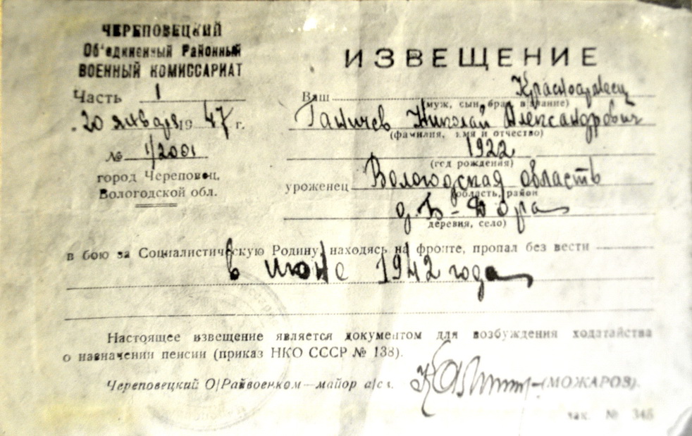 Ганичев Николай АлександровичШкола №2 1940 Выпускник 2-ой средней школы 1940 года. До войны был призван в Красную Армию. Служил в пограничных войсках на Украине, в Волынской области. С фронта прислал только два письма. Пропал без вести. Извещение семья получила только в 1947 году. Из воспоминаний, хранящихся в архиве Музея народного образования. «Ганичев Николай Александрович родился в деревне Б-Дора в 1922 году. Сначала учился железнодорожной школе. Закончив там 7 классов, в 1937 году перешел в школу №2. Он - выпускник 1940 года. Дом Ганичевых находился в Халтуринском переулке, где сейчас находится кинотеатр "Киномир". В их семье было трое детей: Николай и две сестры - Римма и Нина. Родители работали на железной дороге. Отец во время войны отвечал за распределение продуктов между воинскими частями. Детство Николая ничем не отличалось от детства его сверстников. Любил спорт. С друзьями гонял мяч по футбольному полю рядом с домом. Увлекался музыкой, играл на баяне в оркестре Дома пионеров. Дружил с Колей Палтышевым, старательным и скромным мальчишкой, которому учёба давалась труднее. Коля Ганичев учиться любил и умел. Из Армии писал родным, чтобы берегли аттестат, собирался после службы учиться в институте. Службу свою он начал в Волынской области в пограничных войсках, а друг его попал в другую часть. Больше они уже не встретились, началась война. Оба юноши погибли в возрасте 19 лет. С фронта Николай успел написать домой два письма. Последнее датировано 16 июня 1942 года. А в 1947 году пришло извещение, что он пропал без вести, и родные долго надеялись, что он жив и вернётся домой. Никакие поиски результатов не принесли. Скорее всего, он погиб, как и тысячи его одногодок, защищая Родину».