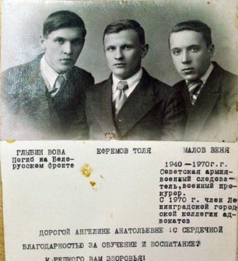 Глыбин ВладимирШкола №1 1938 Родился в 1920 голу в городе Череповце, закончил школу №1 в 1938 году и поступил в Ленинградский горный институт. С первого курса в 1939 году по комсомольской путевке направлен в Военно-Морское училище г. Севастополя. После его окончания служил на Каспийском море, в Гурьеве, форту Шевченко, Карабогаз - Голе. С флота направлен в Белоруссию. Участвовал в ее освобождении в качестве командира артиллерийской батареи. При наступлении в передовых частях подорвался на мине в июле 1944 года. Похоронен в Белоруссии в г. Петрикове. Из воспоминаний Ангелины Анатольевны Алексеевой. «Тихо в читальном зале Дома пионеров. Яркий свет хрустальных люстр, красное сукно на столах, зелень цветов на темных провалах окон. Шелест газет и опущенные над книгами и газетами головы ребят. А за окнами свист, пение и вой зимней метели. Вова Глыбин - секретарь комсомольской организации школы №1. Он очень любил читать. Заберется в угол на кресло и читает до тех пор, пока библиотекарь не напомнит ему, что надо уходить домой. Война началась, когда он был уже офицером на Флоте».